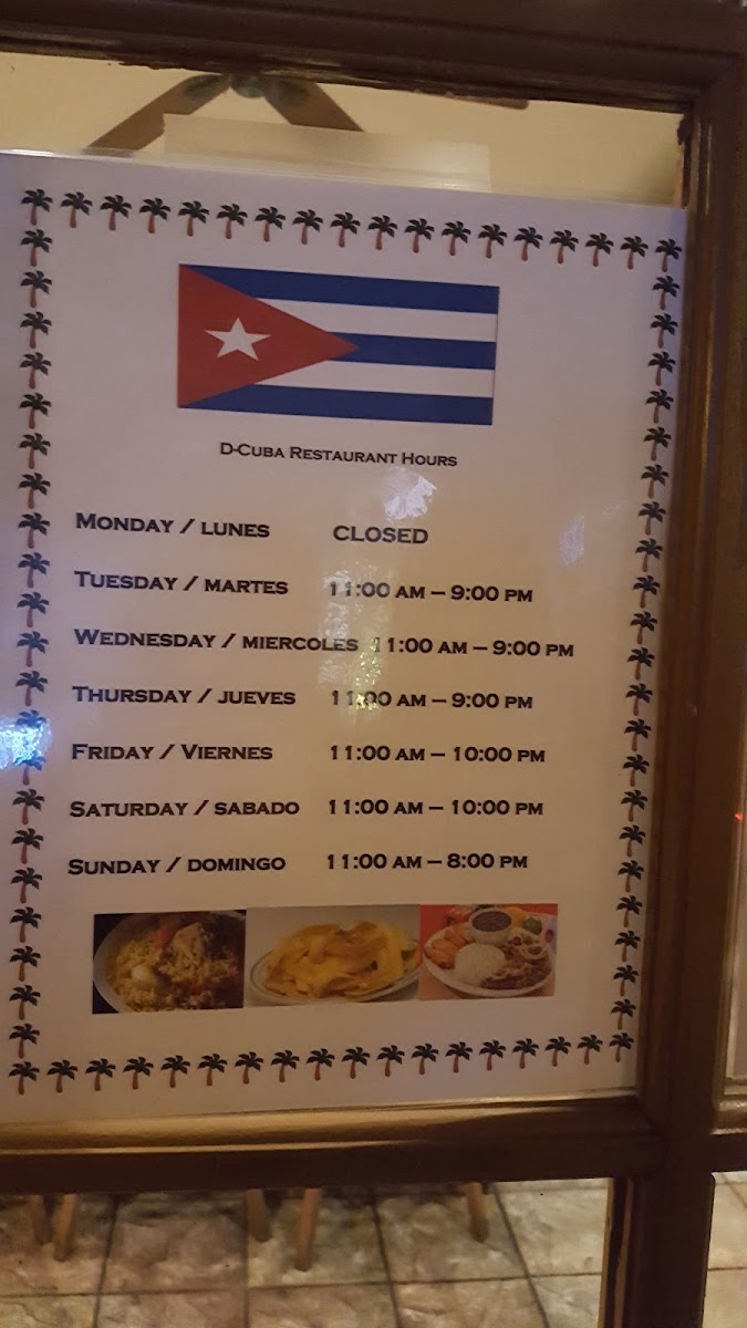 The menu at D'Cuba Restaurant features a selection of traditional Cuban dishes alongside classic Cuban sandwiches and snacks. It is organized into several categories to accommodate various dining preferences, whether for a full meal or lighter options.